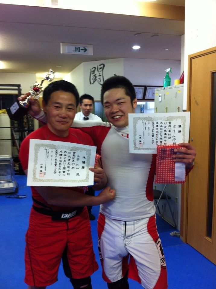 グラウンド戦【結果】 28 4月 2013 カテゴリ: 大会・審査会結果 【中澤さん一回戦延長腕がらみ一本勝ち】 相手は手足が長くてやりづらそうでしたが、さすが中澤さん。 【かずおさん一回戦判定勝ち】 45歳にして、華麗なる飛び十字をしかけてきた相手。盛り上がりました。 【中澤さん二回戦腕がらみ一本勝ち】 貫禄のマスターズ対決。マスターズ・青年混ざってのトーナメントで、勝ち上がった二人。 【かずおさん二回戦チョークスリーパー一本勝ち】 【決勝戦】 中澤さんvsかずおさん ラスト30秒で… かずおさん膝十字一本勝ち! 長野支部ワンツーフィニッシュ ヾ(⌒ー⌒)ノ☆ 押忍